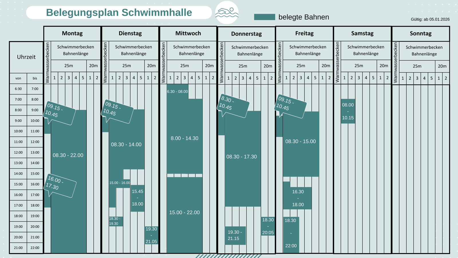 | Donnerstag | 06.30 - 08.00 Uhr 17.30 - 19.30 Uhr 19.30 - 22.00 Uhr (2 Bahnen) | 06.30 - 18.30 Uhr 20.05 - 22.00 Uhr |